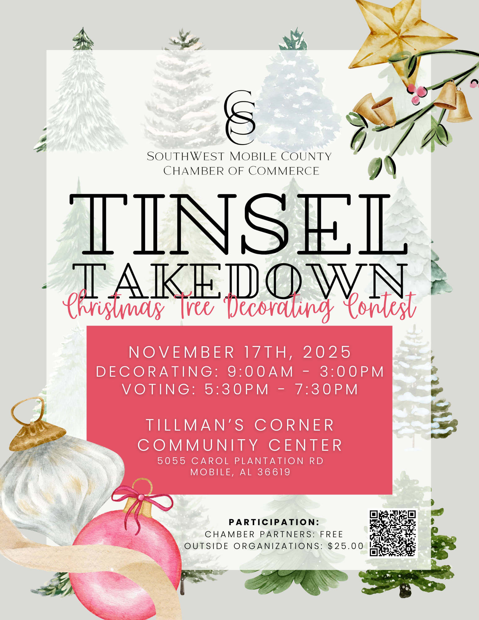 Is your organization willing to participate in our “Tinsel Takedown” Christmas Tree Decorating Contest? We are hoping to create an opportunity for local businesses and organizations to engage with our community through our 3rd Annual Tinsel Takedown. Our goal is to fill the John C. Williams Auditorium with Christmas trees and we need your help to make this happen! Proceeds from this event will go towards the Chamber’s Annual Christmas Giveback Campaign which provided Christmas toys for local children during the holiday season.