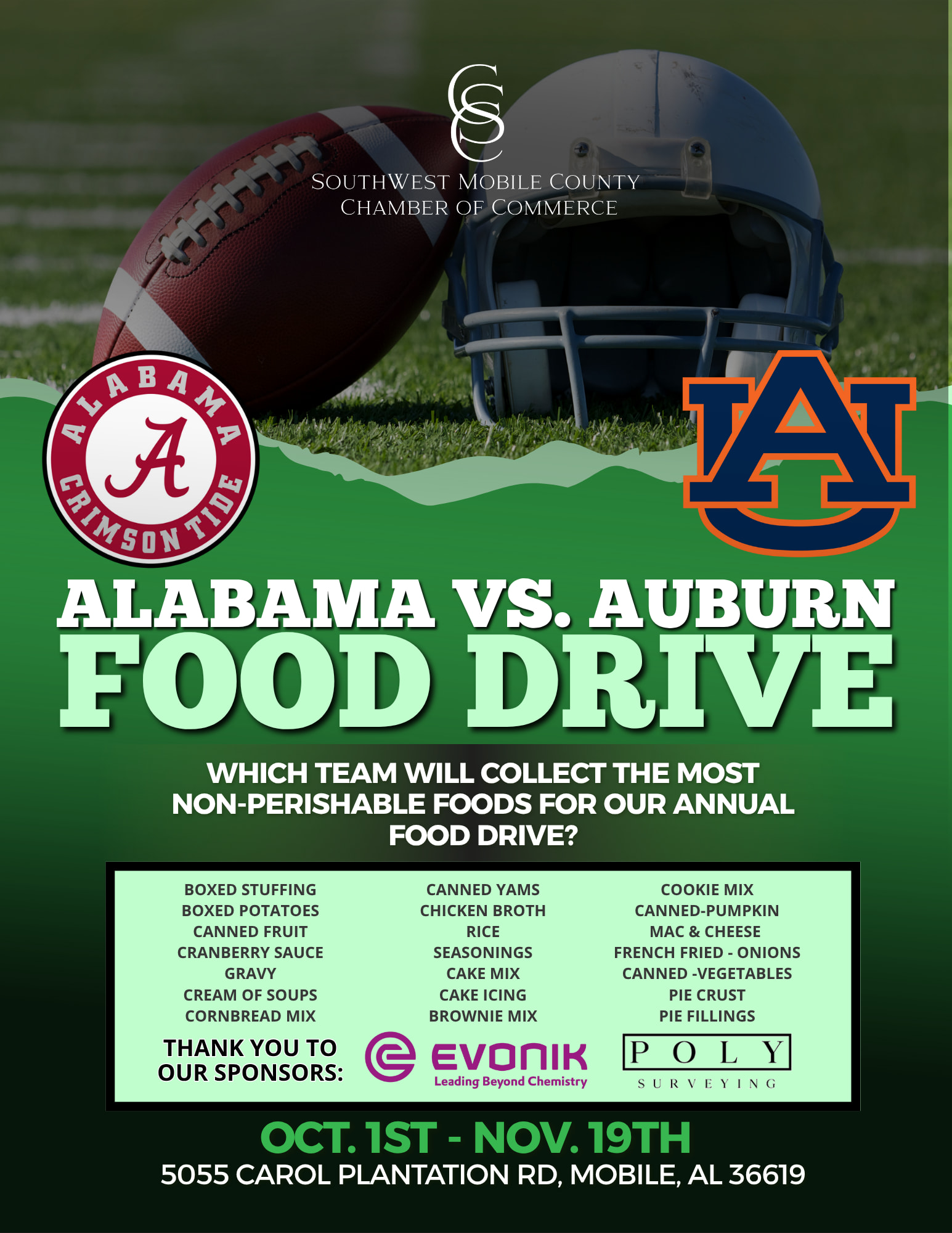 It’s that time of year again—when rivalries heat up for a good cause! Join us in making a meaningful impact during the Annual Alabama vs. Auburn Food Drive, benefitting local elementary school families throughout the Thanksgiving break. The Chamber will be preparing boxes of non-perishable food to support families in need, and we’re calling on our community to help us fill them!